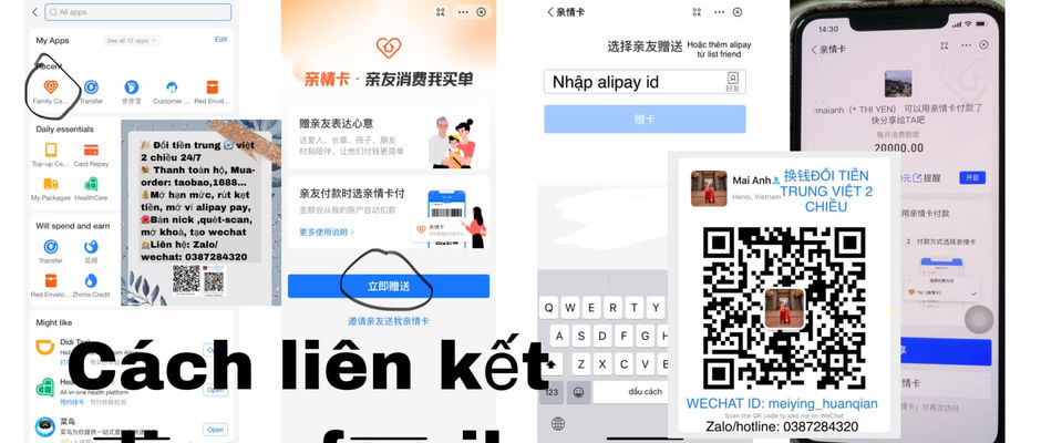 Bước 1- Đăng nhập alipay, chọn family centre Bước 2- Ấn thêm thẻ Bước 3- Nhập alipay id cần liên kết family Bước 4- Chọn hạn mức Bước 5-...